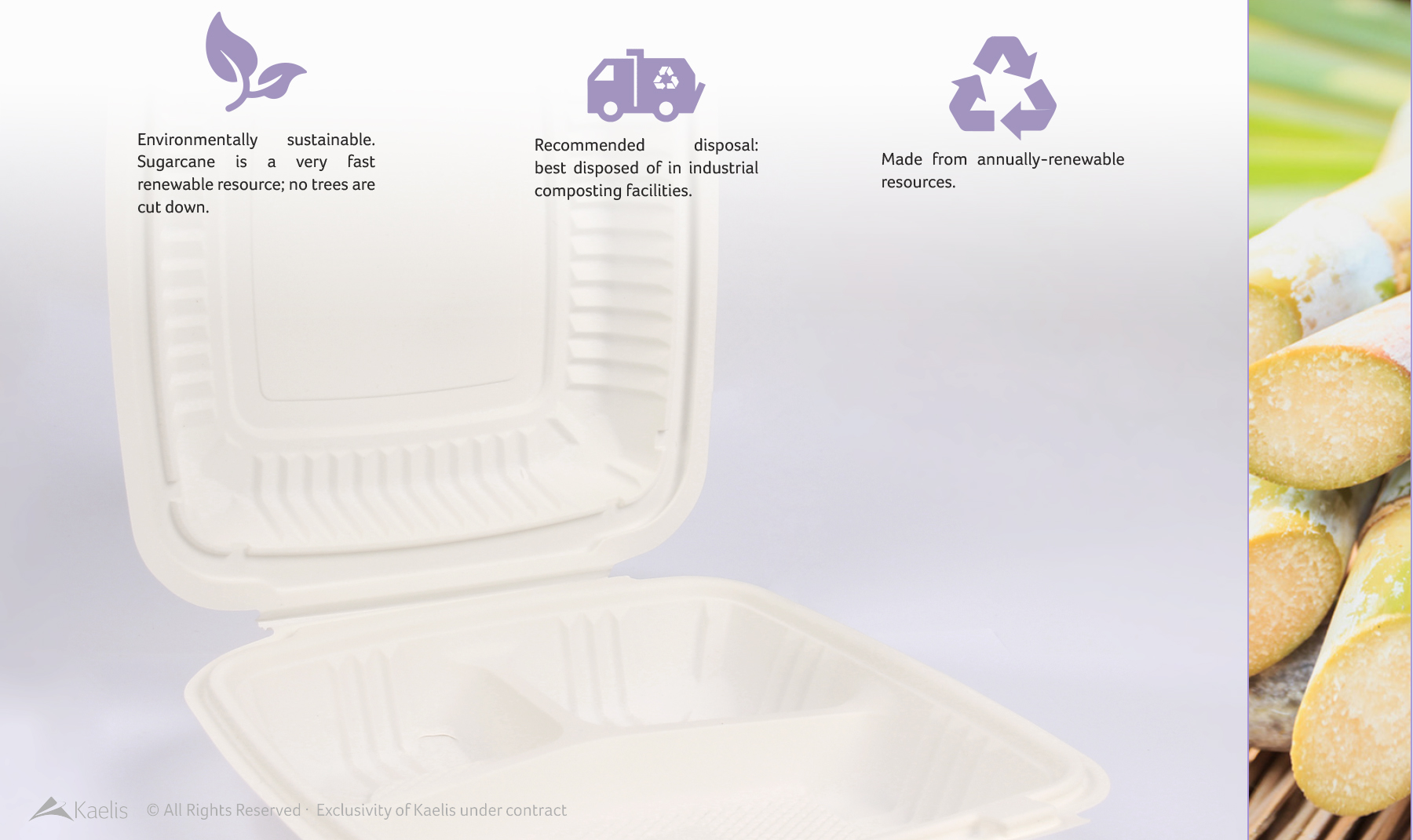 Sugarcane is a very fast renewable resource; no trees are cut down, cost-effective and efficient heat insulation for hot food applications with less “sweating”.