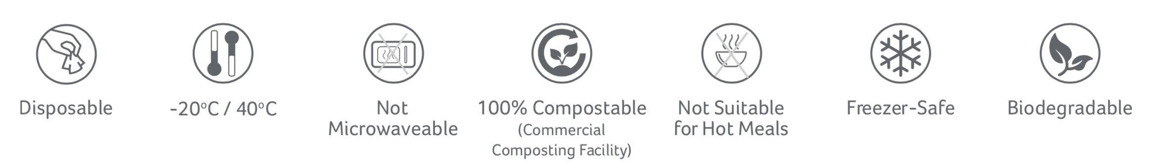 Uses: disposable cutlery (up to 60ºC), disposable trays, snack boxes and salad containers (not suitable for hot meals), cold drinks cups, lids and straws and compostable bags.